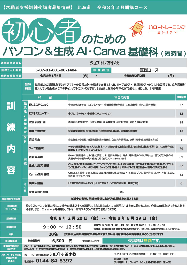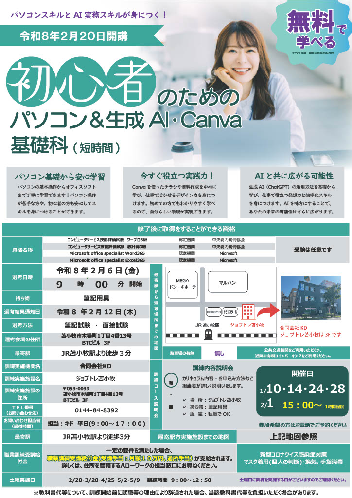 初心者のためのパソコン&生成AI・Canva基礎科(短時間)